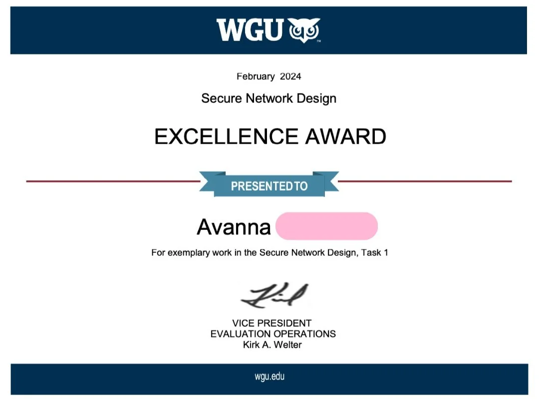 As many of you know, I am currently pursuing my Master’s degree in Cybersecurity & Information Assurance… and I'm thrilled to announce that my recent submission in Secure Network Design has been recognized with an Excellence Award by The WGU Evaluation Faculty! 🏆 Their acknowledgment of my work emphasizes the dedication and commitment I bring to every project.